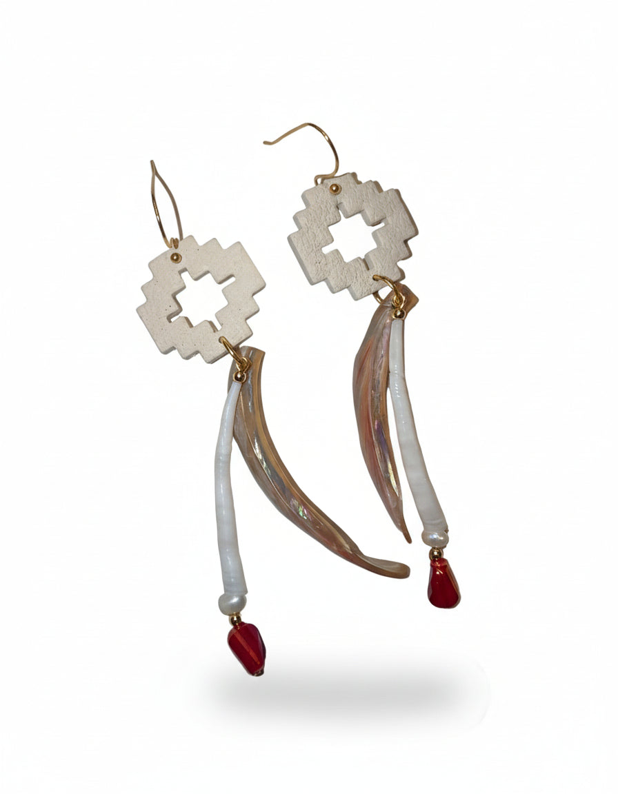 Handmade by Isabella Rose, these earrings feature shimmering abalone shell, traditional dentillium, and white and red beads. Finished with her signature geometric top design, each pair brings a soft, elegant touch with a bold Indigenous spirit.