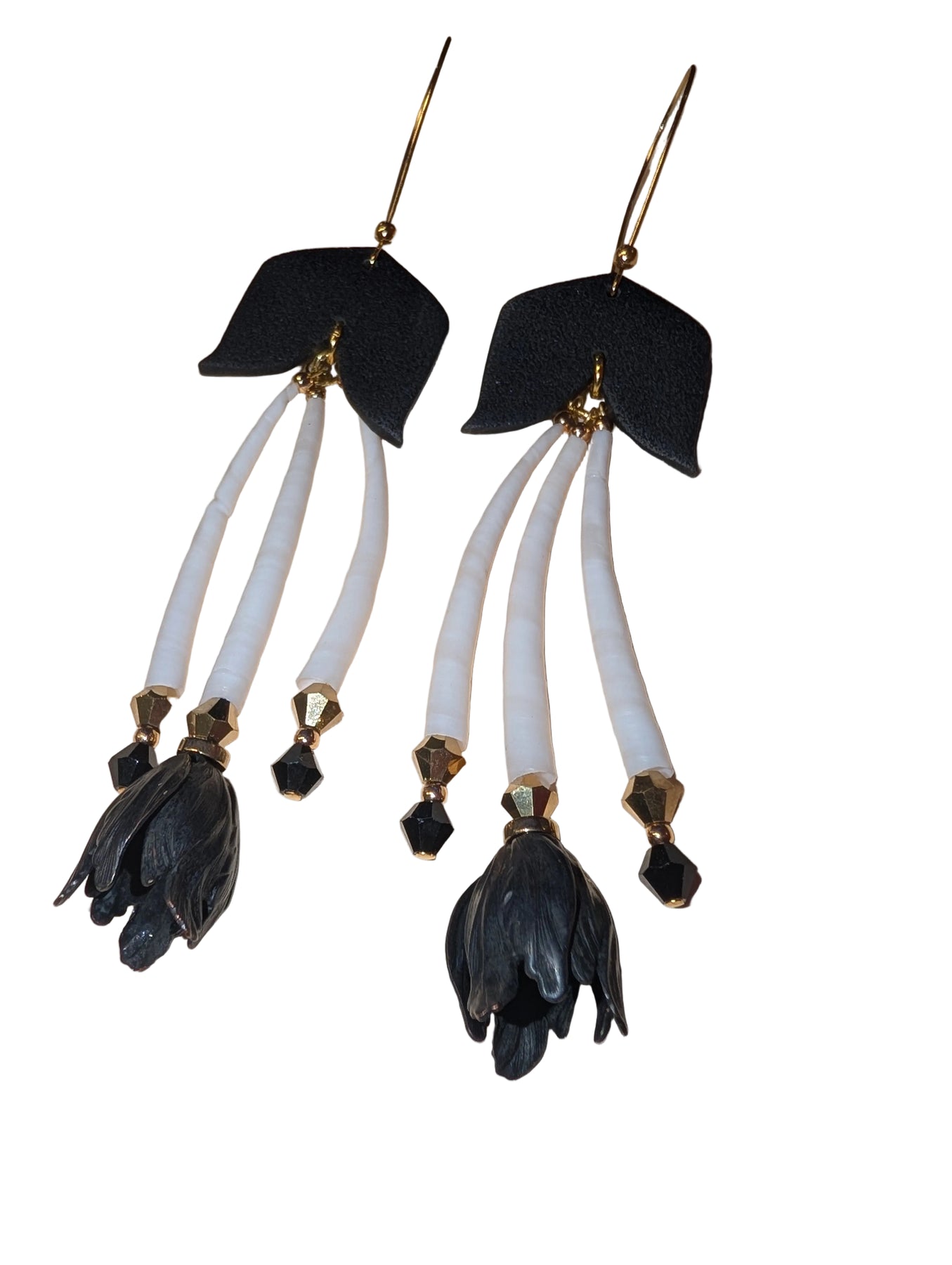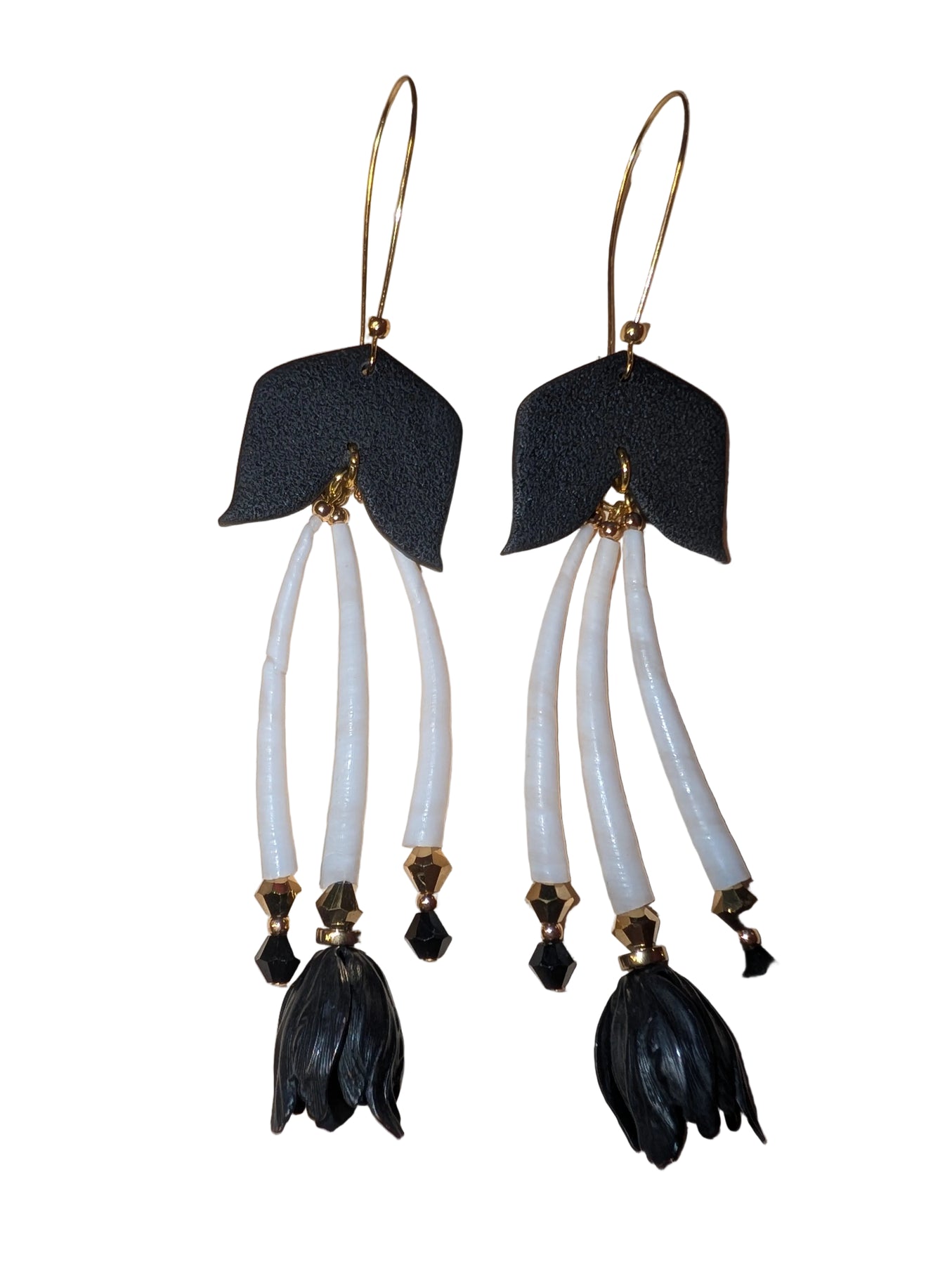 Bold and sculptural earrings featuring natural dentalium shells, faceted glass beads, and hand-shaped black polymer clay. Finished with a striking bell-like drop, these earrings move beautifully and carry a sleek, modern edge with a touch of traditional influence—perfect for making a statement day or night.
