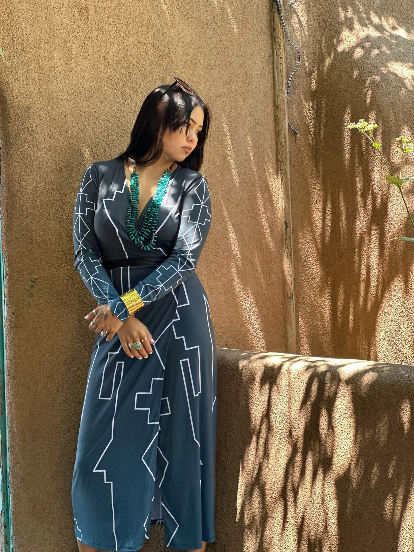 Dark blue to blue ombre with white line designs. Black ribbon