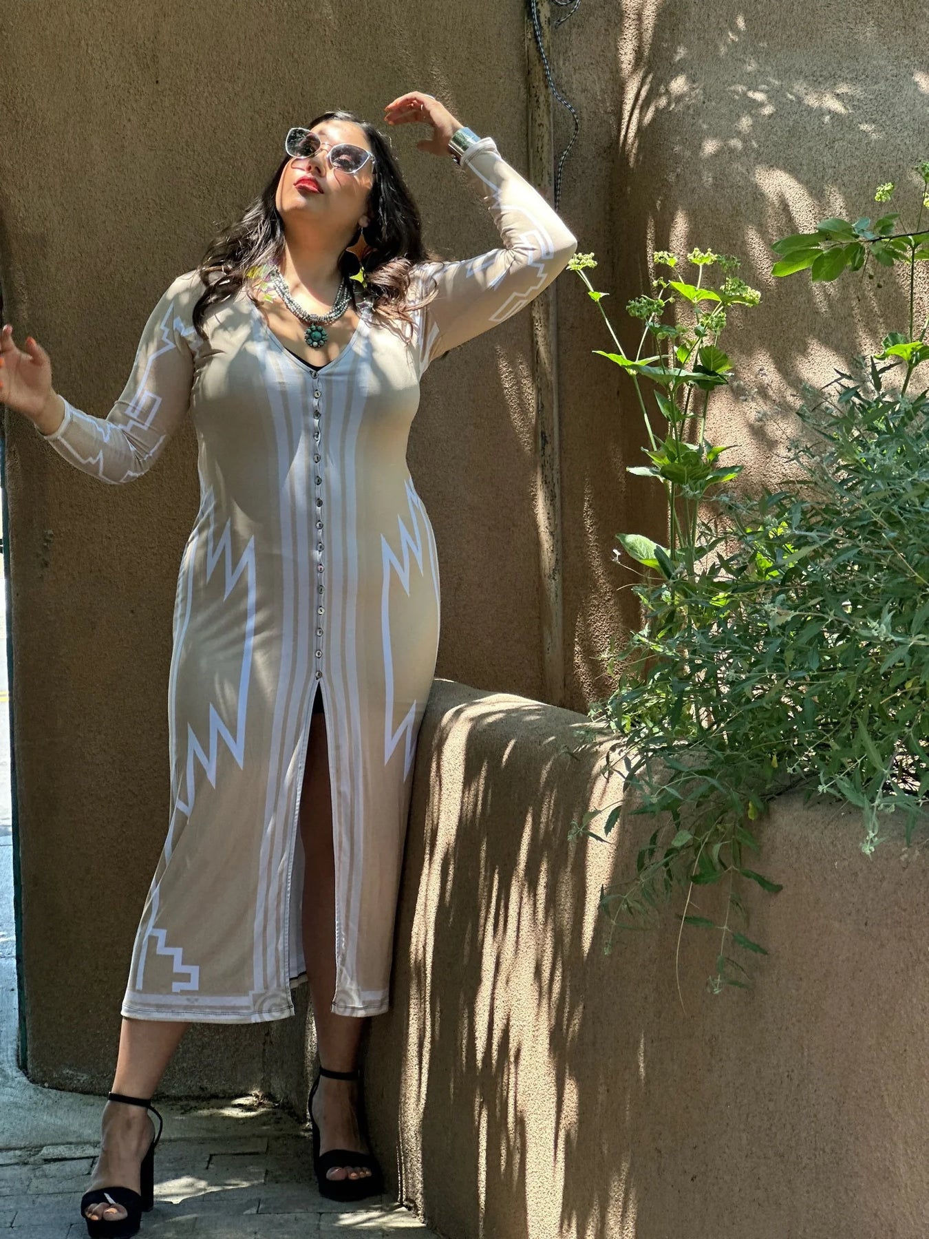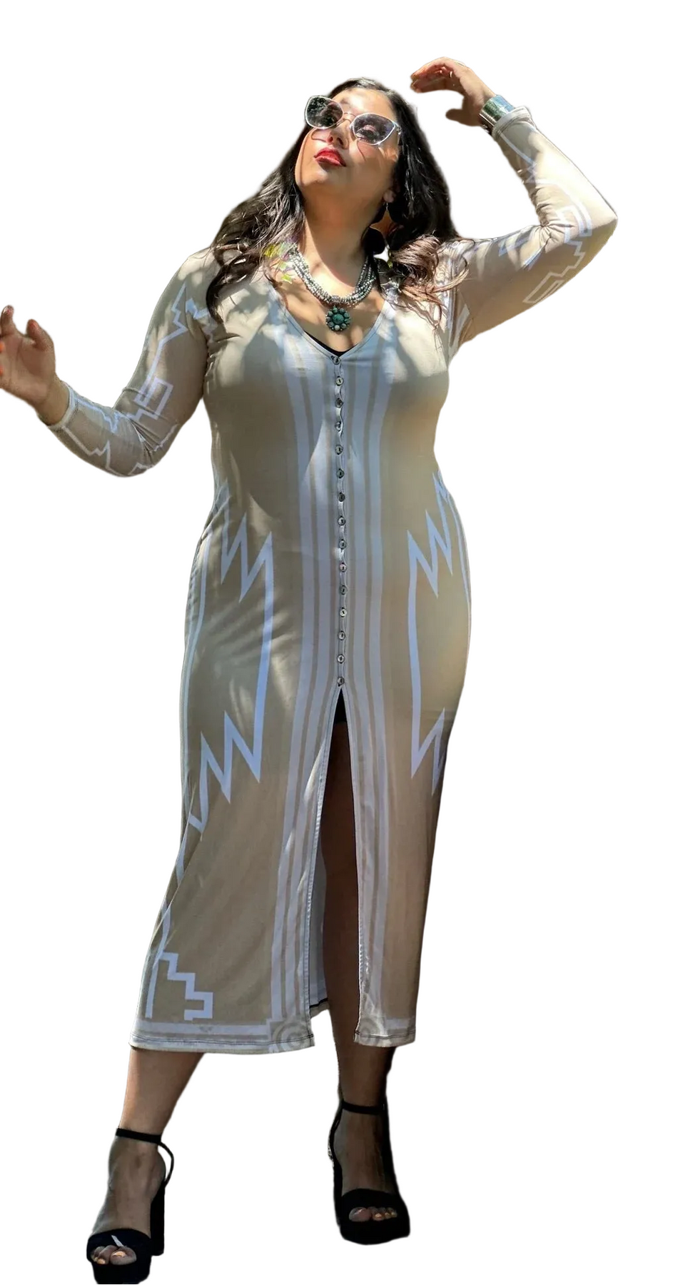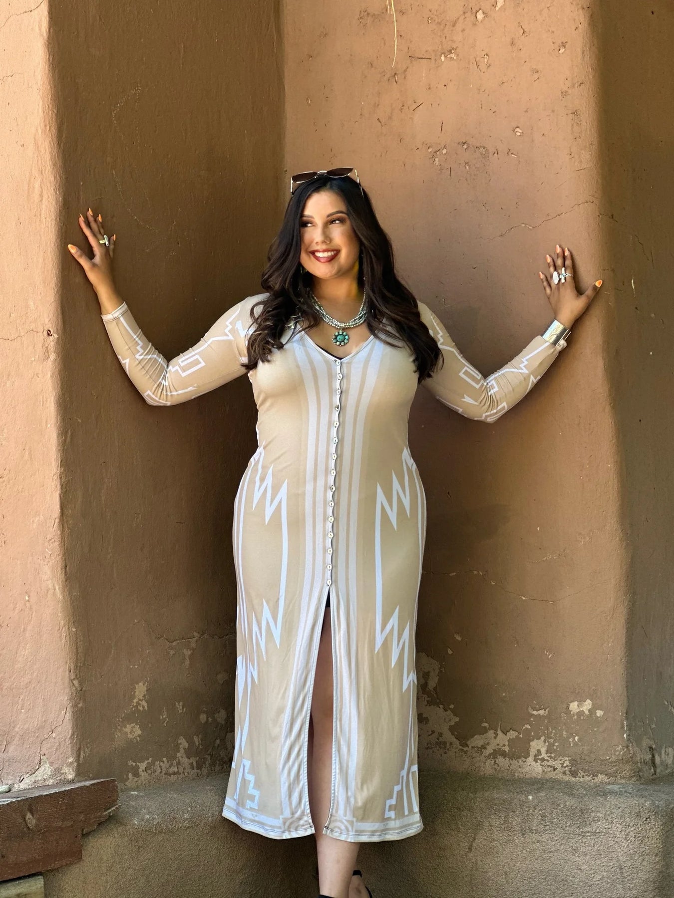 Tan cardigan with white tribal designs. Mother of pearl buttons