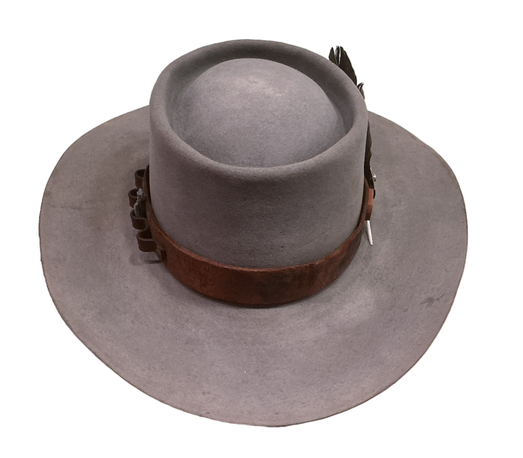 Thunder Voice co, grey hat with leather hat belt, turquoise and silver jewelry w/ a feather , Hat size 7 1/2