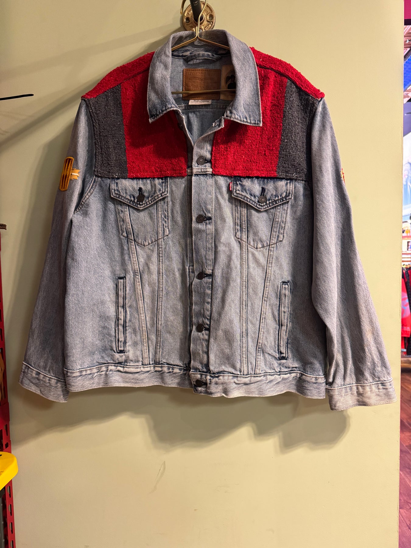 A truly premium product built not just to impress but to last. Original reclaimed vintage Levi's jacket made by Thunder Voice Hat Company. TVHC art panel, blanket fragments, and patches. signature "protect the sacred" panel on jacket back.